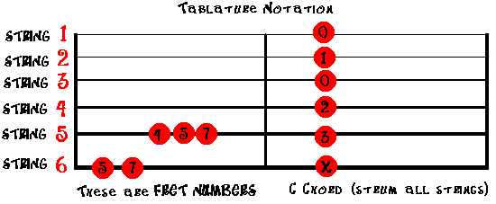 The numbers on the TABLATURE GRID represent the FRET NUMBER that is to be played ON THAT STRING.The example on the left side of the TAB GRID is a short scale in the key of "A". It starts on the 5th fret on the Sixth string... then the 7th. Next it goes up a string to the 4th fret on the 5th string...the 5th, the 7th, and so on... These notes are to be played in a succesion. The right side of the TAB GRID shows a "C CHORD". Notice that all of the notes are "stacked up." This means they are all to be played all at once, and not in succesion. The "O" represents an "open" string is to be played. As in standard music notation, there are many different symbols to represent notes, technique, and how the guitar is to be played in TAB as well. These will become more and more familiar as you progress. There is not a lot of in-depth coverage of TAB in VIDEO GUITAR LESSONS, however, there are links to great guitar sites where the advanced student can go to learn more about TABLATURE or "TAB" as it is reffered to. Tab has not been around a long time compared to conventional musical instruments and seemed to gain it's popularity in the 1980's. It might make one wonder what TAB for a piano or clarinet might look like.... TAB - picture it...